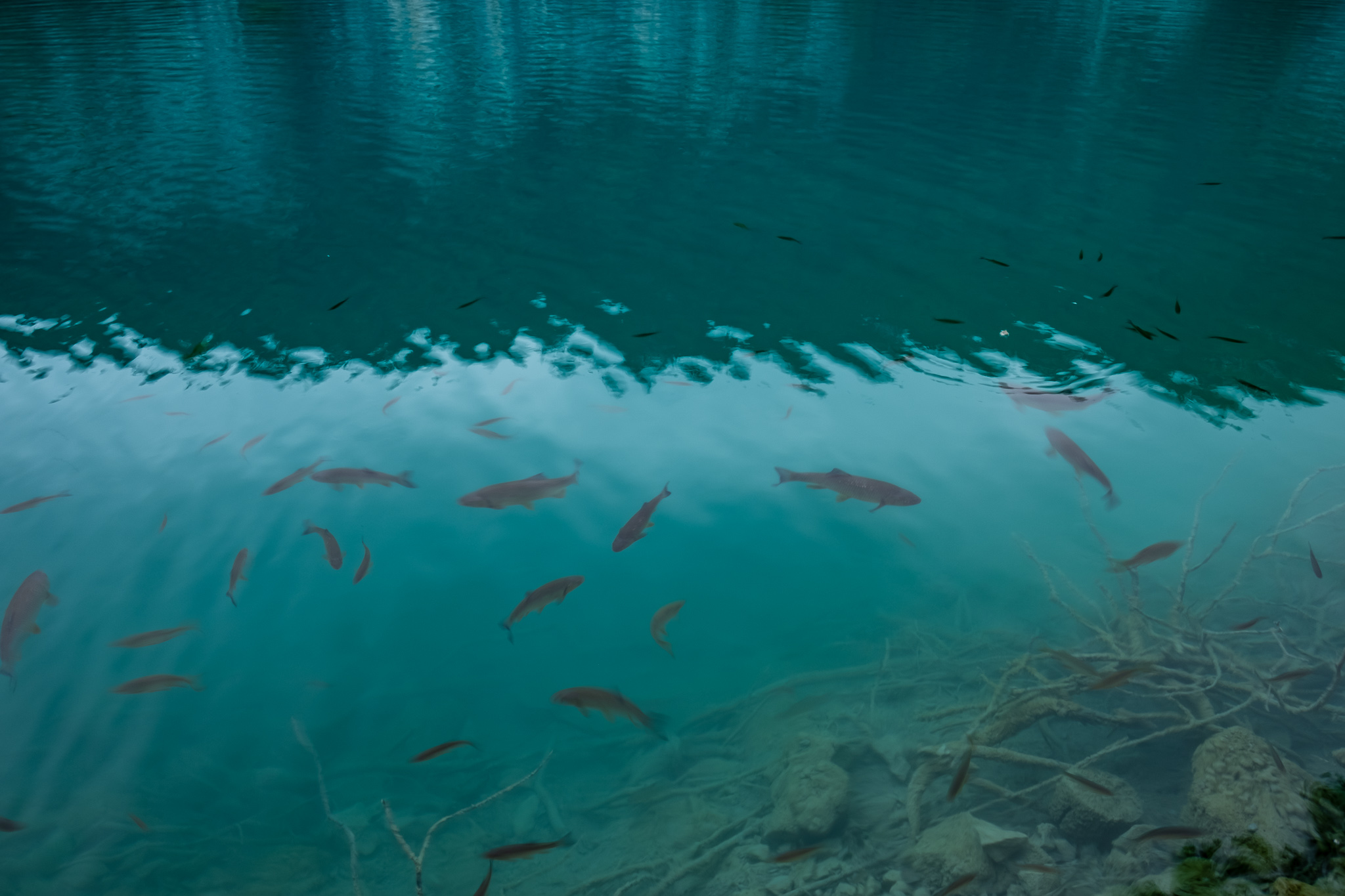 We walked 15 minutes down to the entrance where we waited in line to get on a tram to drive us up to where we would begin our walk. Two trams left just as we got there and so we waited for the next one to arrive. We piled onto the tram with around ~100 others and set off for station ST3. Once we arrived, we started our walk down the wooden boardwalk through this serene landscape. Plitvice is a series of lakes that cascade into one another through successive drops in elevation. As such, boardwalks provide the means to walk through the park as the entire landscape is lakes and waterfalls. The boardwalks are wide enough for two people to pass each other comfortably, but this comfortable space quickly disappears as people would stop for selfies and pictures. At one point during our walk, we came upon a queued line on the boardwalk. Looking at the map, it looked as though we should be getting close to the dock where we were supposed to catch a ferry to the other side of the lake so we figured this could be the line for that. Turns out, this line was due to people taking selfies at the waterfall up ahead. Apparently in busy times, it's not unheard of that people end up in the water due to being edged off the boardwalk. Though this didn't happen, I didn't have to stretch my imagination too far to see it happening.